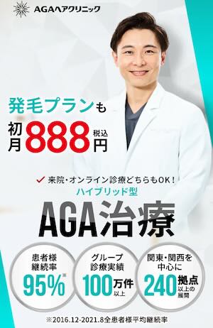 | AGAヘアクリニック | 初月888円〜 (以降3,600円〜) | ○ 初回診察は来院必須 | 継続率95%※2/全国240院 | 2回目以降オンライン希望・実績重視・全国展開 |